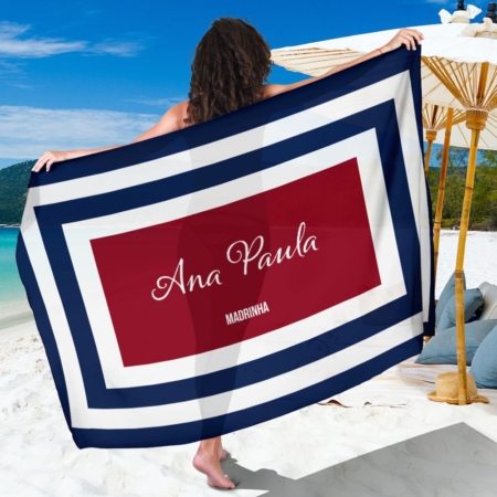 • Canga Personalizada com nome detalhe retangular azul, vermelho e branco 90x130cm MCLISTA14