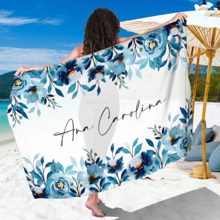 • Canga Personalizada floral aquarela tons azuis com nome 90x130cm mcf8