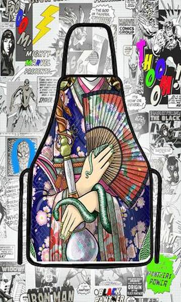 Avental em tecido microfibra com impressão qualidade digital, sendo bem aproximada à da foto, produto de fácil lavagem e secagem rápida, detalhe com viés lateral e alças.